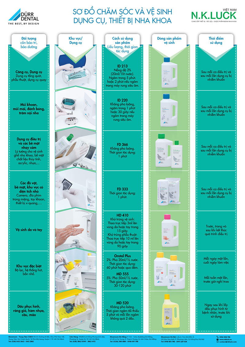 Bên cạnh máy móc, thiết bị hiện đại hỗ trợ cho quá trình khử khuẩn thì việc lựa chọn hóa chất làm sạch cũng là vấn đề được các phòng nha quan tâm hàng đầu. N.K.Luck xin giới thiệu đến quý Bác sĩ phòng khám bộ dung dịch vệ sinh khử khuẩn của Durr Dental (Đức). Độ tin cậy của dung dịch vệ sinh Durr Dental được đánh giá rất cao vì sản phẩm đã được kiểm nghiệm lâm sàng và đạt tiêu chuẩn VAH/DGHM. Khử trùng bằng dung dịch Durr Dental là cách tốt nhất để tiêu diệt tất cả các vi sinh vật, virus và mầm bệnh.