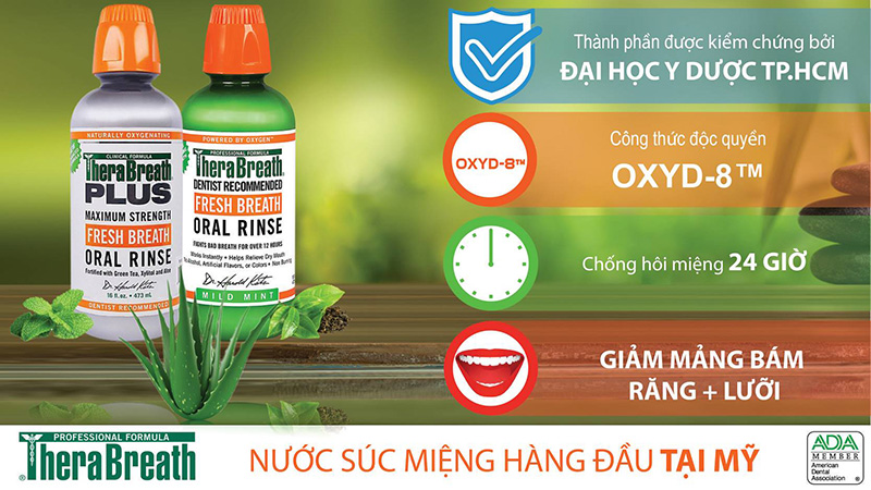 TheraBreath là sản phẩm chăm sóc răng miệng đột phá mang tính “cách mạng” vì nó tấn công chính vào vi khuẩn gây hôi miệng. Với những thành phần hoàn toàn tự nhiên cung cấp oxy được cấp bằng sáng chế Oxyd-8 TM, TheraBreath không ngăn mùi hôi từ răng miệng bằng hương thơm hoặc mùi mạnh. Nó sử dụng sức mạnh oxy hóa của OXYD-8® diệt sạch mùi hôi khó chịu, kích thích tiết nước bọt để chống khô miệng, hơi thở có mùi, các bệnh về nướu răng, sâu răng, răng xỉn màu, răng nhạy cảm và nhiệt miệng.