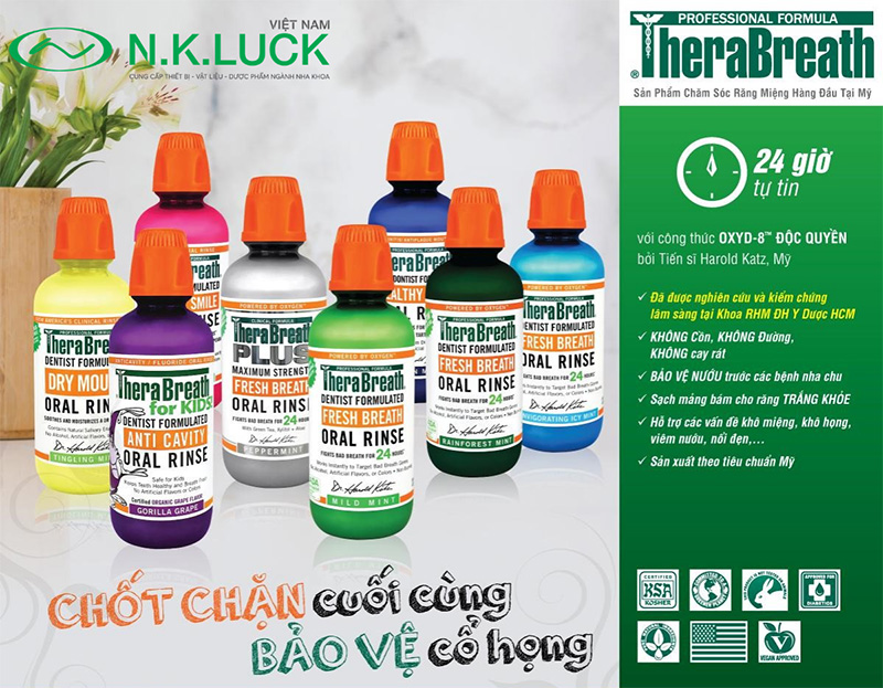Trên đây là toàn bộ hướng dẫn chi tiết của N.K.Luck về việc sử dụng nước súc miệng TheraBreath đúng cách – chuẩn y khoa cũng như những chỉ định cần lưu ý khi sử dụng sản phẩm. Hiện N.K.Luck đang là đối tác và nhà phân phối chính hãng của TheraBreath tại Việt Nam. Chúng tôi đã cung cấp bộ sản phẩm TheraBreath chính hãng với số lượng lớn cho nhiều Bác Sĩ/phòng khám trên cả nước. Sử dụng các sản phẩm chăm sóc răng miệng được phân phối bởi N.K.Luck, quý Bác sĩ/khách hàng có thể hoàn toàn yên tâm về chất lượng, dịch vụ cũng như giá cả.