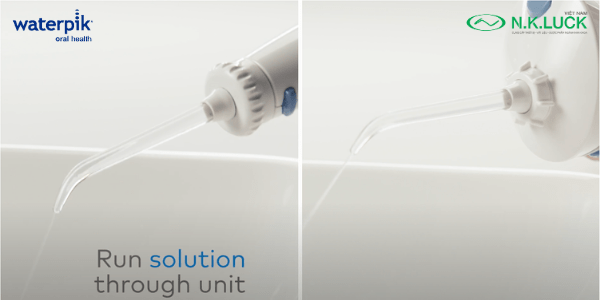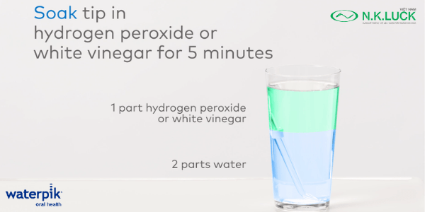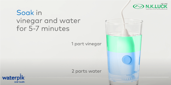 Tháo đầu tay cầm ra khỏi thiết bị bằng nút đẩy rồi ngâm trong dung dịch vệ sinh thiết bị hoặc trong bình chứa 2 phần nước, 1 phần hydrogen peroxide hoặc giấm trắng trong 5 phút. Rửa sạch tay cầm bằng nước ấm. Để đạt được hiệu quả tối đa theo thời gian, N.K.Luck khuyên bạn nên thay đầu tăm Water Flosser mỗi 3 – 6 tháng vì chúng có thể bị tắc hoặc bị ảnh hưởng bởi cặn khoáng tích tụ trong thời gian sử dụng.
