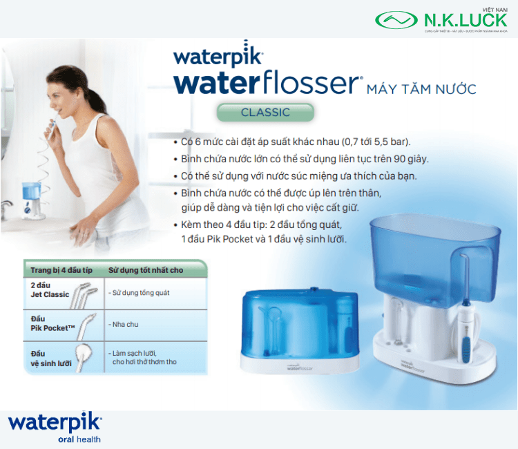 - WaterPik Classic: Là dòng máy chuyên dụng dành cho người đang đeo mắc cài, làm Implant, veneer,.. Với bình chứa nước cải tiến, có thể sử dụng liên tục trong vòng 90s, máy tăm nước WaterPik Classic được chứng minh lâm sàng có hiệu quả hơn chỉ nha khoa và tăm hơi cho việc làm giảm mảng bám, viêm nướu, bệnh nướu răng…