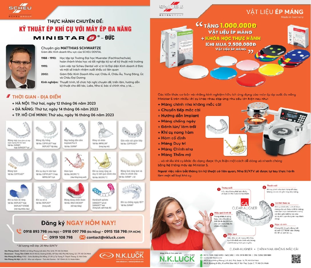 Để giúp mọi người có thể hình dung rõ hơn về cơ chế cũng như quy trình sản xuất một khí cụ nha khoa cơ bản như máng chỉnh nha, công ty vật tư nha khoa N.K.LUCK Việt Nam cùng đối tác Scheu Dental hân hạnh mời Quý Bác sĩ, Kỹ thuật viên tham dự Ngày Hội “Điêu Khắc” Scheu Dental. Đến với hội thảo này, chuyên gia Matthias Schwartze từ Scheu Dental (Đức) sẽ chia sẻ quá trình tạo hình và sử dụng các loại khí cụ quan trọng trong điều trị nha khoa hiện đại. Từ vật liệu ép máng tiêu chuẩn cao đến máy ép áp suất đa năng Biostar tiên tiến.