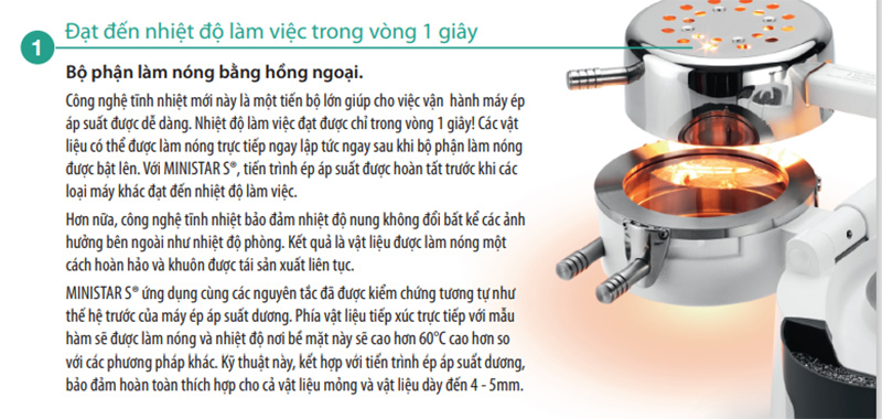 Máy ép áp suất đa năng Ministar S được trang bị công nghệ tĩnh nhiệt (làm nóng bằng tia hồng ngoại). Tính năng này giúp cho thiết bị có thể đạt được nhiệt độ sẵn sàng làm việc chỉ trong vòng 1 giây, rất nhanh chóng và hiệu quả. Ngay sau khi bác sĩ kéo cần gạt làm nóng, các vật liệu sẽ được làm nóng trực tiếp và tức thì, nhanh hơn gấp nhiều lần so với các thiết bị ép áp suất khác trên thị trường.