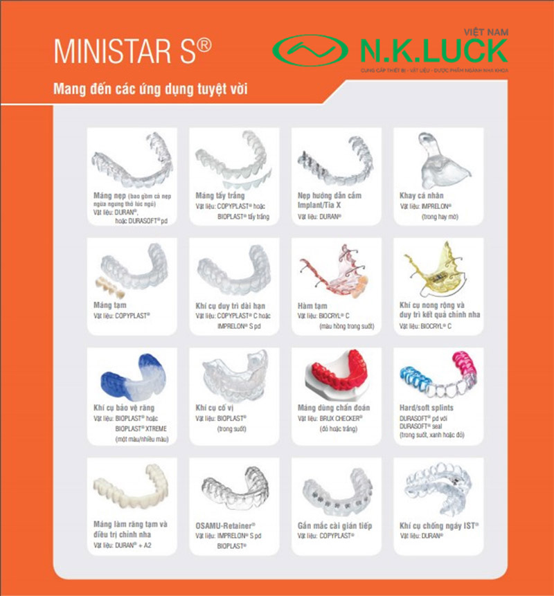 Hiện nay, với máy ép áp suất đa năng Ministar S, bác sĩ có thể trực tiếp tạo ra đa dạng các khí cụ chỉnh nha, phù hợp với từng vấn đề khiếm khuyết răng trong nhiều trường hợp khác nhau. Thông qua việc sử dụng thiết bị Ministar S kết hợp cùng đa dạng loại vật liệu ép và nhiều phụ kiện đi kèm, bác sĩ có thể tạo ra các loại khí cụ chỉnh nha, khay chuyên biệt cho từng trường hợp.