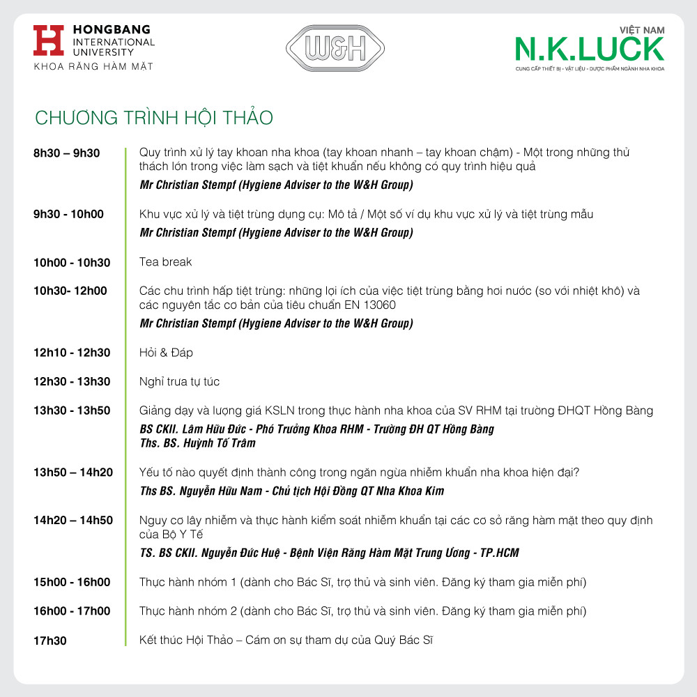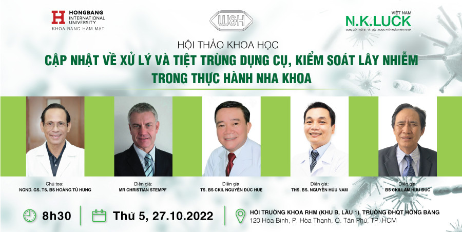 N.K.LUCK Việt Nam trân trọng kính mời Quý Bác sĩ tham gia hội thảo chủ đề “Cập nhật về xử lý và tiệt trùng dụng cụ – Kiểm soát lây nhiễm trong thực hành nha khoa” tại Trường Đại học Quốc tế Hồng Bàng (HIU) vào 27.10.2022.