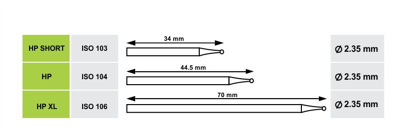 - Mũi mài cán thẳng dài: được kết hợp với tay mài chậm (Long Straight Shank – HP). Mũi có chỉ số ISO thường bắt đầu là 1xx. Đây là mũi mài kích thước lớn thường xuyên dùng cho tay mài máy Marathon trong labo hoặc tay khoan thẳng trên ghế điều trị nha khoa với tốc độ chậm. Mũi có đường kính là 2.35mm, tổng chiều dài thường từ 40mm đến 44.5mm.