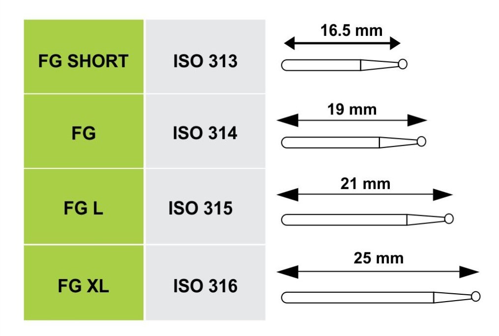 - Mũi mài cán ngắn, thẳng: sử dụng với tay mài nhanh (Friction Grip Shank – FG). Mũi có chỉ số ISO thường bắt đầu là 3xx. Đường kính của mũi 1.6mm và tổng chiều dài trung bình từ 19mm đến 24.5 mm.